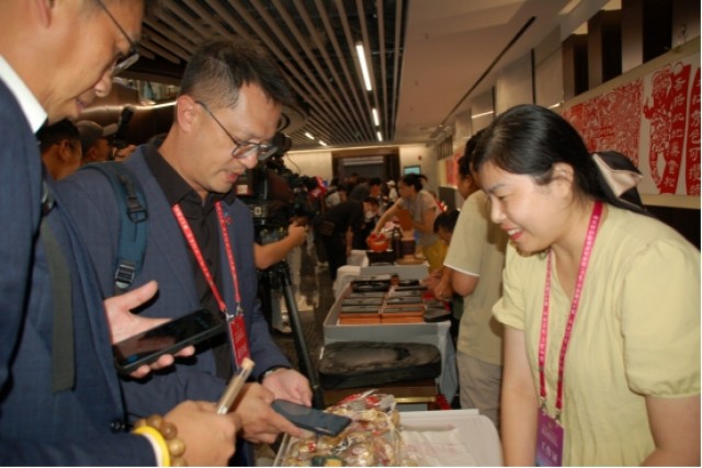 外场还设置了江西文旅推介会非遗展示项目,共青香包制作技艺、金星砚制作技艺、武宁布贴画、都昌绳结编织技艺等丰富多元的项目,吸引与会嘉宾深入参与体验。