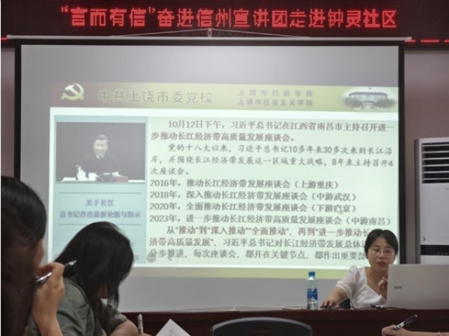 宣讲会上,张老师以《奋力谱写中国式现代化江西篇章——深入学习贯彻习近平总书记考察江西重要讲话精神》为主题,为居民们提供了全面系统的辅导,她从学习长江经济带发展座谈会、“三驾马车”看中国经济动力之变等多个角度,深入浅出地解读了习近平总书记的考察讲话精神。同时,张老师还结合上饶本土企业的发展状况,从“充分认识重大意义”、“深刻领会战略定位”、“准确把握任务要求”、“坚决抓好贯彻落实”四个方面,将美丽信州的发展与居民切身利益紧密结合,让党的声音既“入耳”又“入心”。