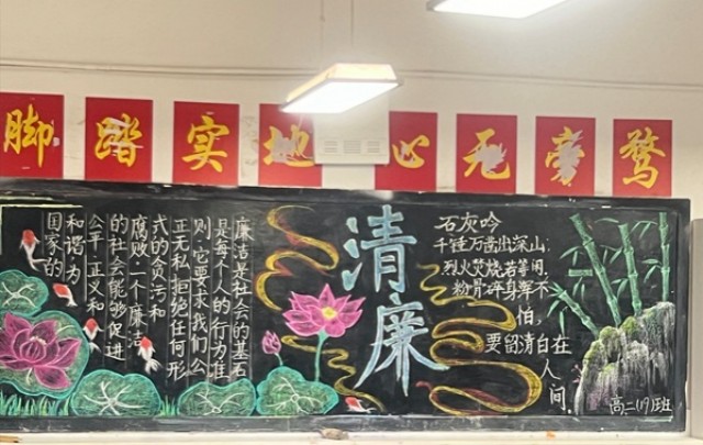 各班积极组织学生利用课余时间,围绕“清廉”主题,精心设计版面,以图绘廉、以文述廉,创作的每块黑板报都做到主题鲜明、寓意深刻、色彩协调,体现了对清廉之风的崇尚,对清廉之志的认同。黑板报内容丰富多彩,有关于清廉的格言警句,有令人深思的廉政小故事,有朗朗上口的廉政歌谣,可读性强,富有教育警示意义。