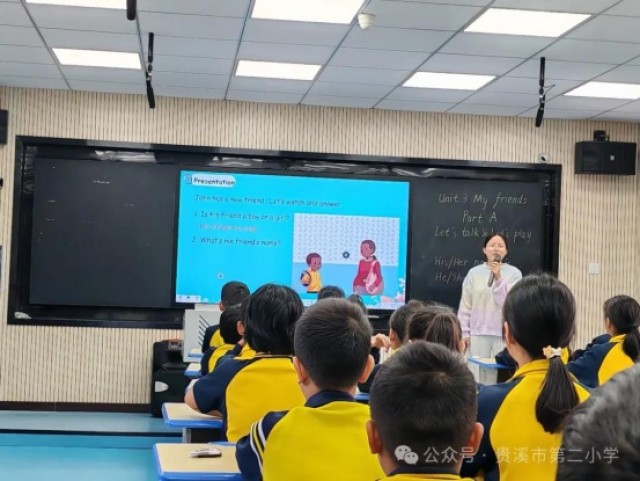10月31日上午第二节课,英语组新教师江依娜老师为大家带来了一堂四年级上册第三单元My friends的对话课。江老师深入研究教材,了解学生,认真备课,精心设计,展现了具有个人特色的课堂风采。课堂伊始,江老师温故引新,引导学生复习学过的朋友特征,再请全班同学介绍自己的同桌,贴近学生的生活实际,孩子们非常感兴趣,围绕话题展开了对话。新学期有新的朋友自然而然引入课本人物John的新朋友,通过听音回答问题,听音跟读,对话填空,角色扮演,教学语法重难点讲解等一系列活动,对教材层层剖析,有序推进,学生在活动中学习,在任务中理解掌握课文重难点。