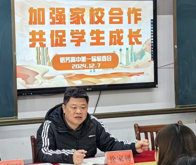 12月7日上午9时,上饶市广信区信芳高中在学校四楼会议室召开了高一、高二年级家委会会议。校长徐家朝、副校长徐先秀、校长助理曾小平、政教处主任杨顺利、教务处主任沈超参加了会议。来自高一、高二年级家委会成员的63位家长与学校领导欢聚一堂,共商校是、家事、学生事。