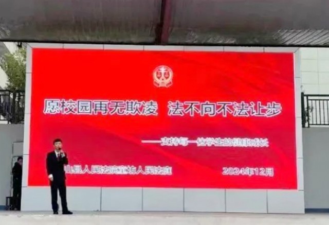 “同学们,希望你们在今后的学习生活里,树立正确的法律意识,尊敬老师、团结同学,能大胆向校园不法行为说‘不’,争做有文化、讲担当、明是非、守规矩的新时代好青年......”