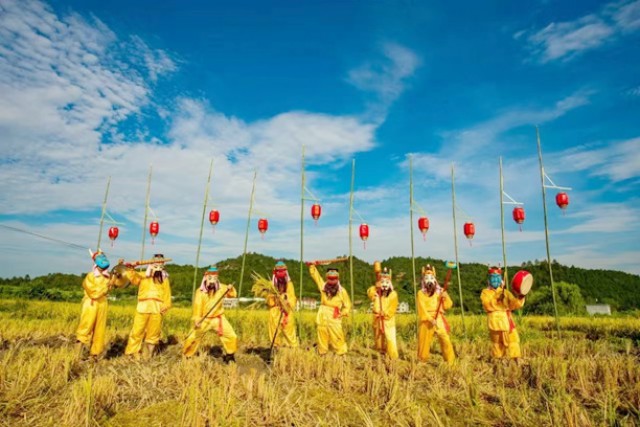 “打戏头古”之所以不像其他地方的傩舞在春节期间跳,而选择端午节期间跳,除了与传说相关外,还有一个重要原因是,乐安县城无大河,端午节不能划龙船,即以跳傩代替。这一天的游傩仪式十分讲究,端午节前一天晚上,傩班人员不能在家过夜,必须洗身净体,次日清早,身穿黑色夏布衣袍,外披挂满铜钱的渔网衫,走起来叮当作响,每个傩神由二人搀扶打扇,三步一跪,七步一拜,过街游市,汇集鳌溪河边。各个傩队赛舞竞技,串、翻、蹦、跳,飘逸轻盈,飞刀交换,刀法精确惊险刺激。两岸游人观者如潮,旌旗挥舞,热闹非凡。这也是“旗傩舞”名称的来历之一。