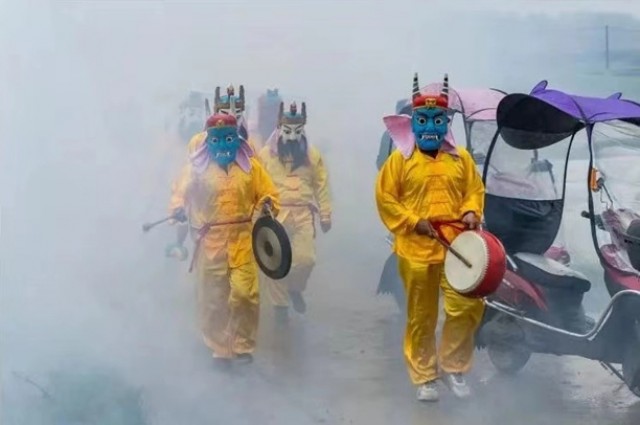 《打闹帚》是“罗山打戏头古”的压台节目。先出场的是龙王,手持两把闹帚(用竹筒劈制,类似刷锅筅帚的刷子),舞动对击,发出“啪啪”声响,然后哪吒上场,与其搏斗,这时,锣鼓手戴上“千里眼、顺风耳”的面具上场紧锣密鼓敲打。玄母娘娘摇蒲扇,判官抱“盐箩”,元王与雷阵子持兵器站立高台,众神全部登场,各自激烈对打,形成集体舞蹈场面,将气氛推向高潮,整个表演在造型中结束。(王国庆)
