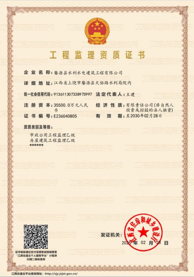 近日,婺源县水利水电建筑工程有限公司(以下简称“婺源水建”)成功取得市政公用工程监理乙级资质和房屋建筑工程监理乙级资质,标志着该企业在突破传统业务格局、迈向多元化发展道路上取得重要突破。此次资质升级不仅是对企业综合实力的认可,更彰显了其主动适应市场变革、拓宽发展空间的战略远见。