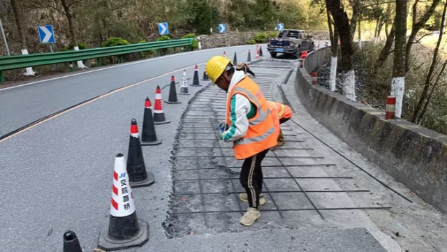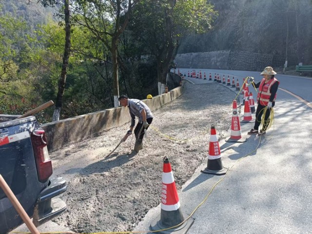 为了彻底消除道路安全隐患,三清山公路中心决定对该隐患路段进行进一步的路面修复处置,3月25日,趁着晴好天气,养护人员迅速行动,挖除了下沉开裂的路面部分,并重新浇筑了钢筋混凝土基层。