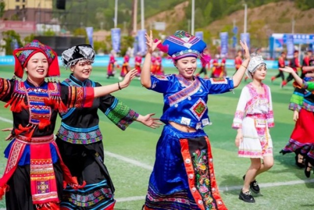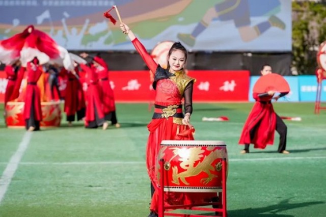 开幕式上,随着铿锵的鼓点响起,《千人傩舞操》表演拉开了比赛序幕。千名学生头戴古朴傩面具,动作整齐划一,气势恢宏,神秘庄严的傩文化在绿茵场上焕发新生。紧接着,《百人竹竿舞》登场,竹竿清脆的敲击声与舞者灵动的步伐交织,展现了浓郁的民族风情。随后,民族舞《奔腾》点燃全场热情,舞者们以矫健的舞姿演绎草原骏马飞驰的意象,传递出昂扬向上的精神力量。