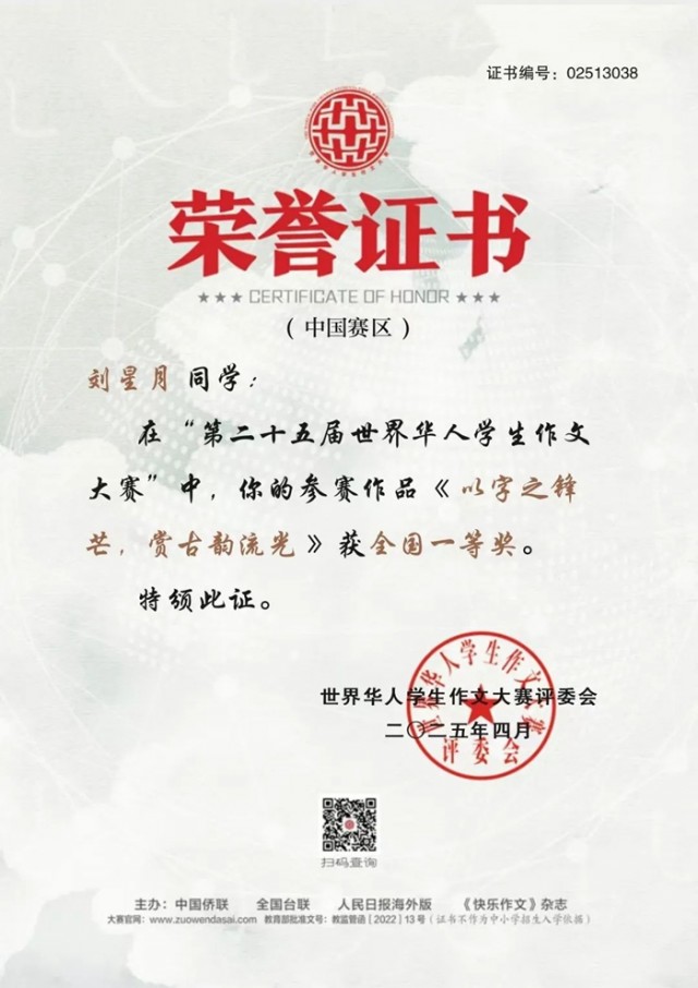 作为教育部认证的白名单赛事,世界华人学生作文大赛始终以传承中华文化为使命,通过搭建全球华人学子写作交流平台,激发青少年中文创作热情,提升文化表达能力。本届大赛中,铅山一中参赛作品以独特的文化视角、扎实的文字功底和创新的思维表达,生动展现了汉字艺术的魅力与传统文化的时代价值。学子们以笔墨为舟楫,在古典意蕴与现代精神间架起桥梁,既有对诗词典籍的深邃解读,又有对非遗技艺的鲜活传承,更有对家国情怀的青春诠释,最终凭借兼具思想性与艺术性的佳作,在众多参赛稿件中脱颖而出,为中华文化海外传播注入青春力量。(余素兰)