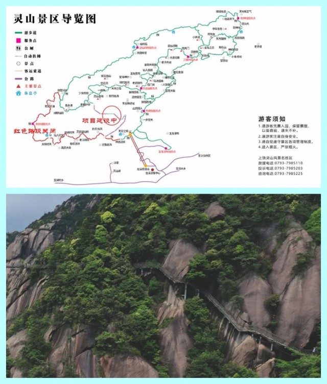 因近期栈道升级改造,灵山景区栈道211路线暂时关闭,具体开放时间另行通知,在此期间,游客须往索道上站右侧的985路线游览,游玩后须原路返回或从“云顶栈道”咖啡屋旁边栈道至985栈道返回,如有疑问请拨打咨询电话0793-7985225。给您带来不便,我们深表歉意,感谢您的理解与配合。
