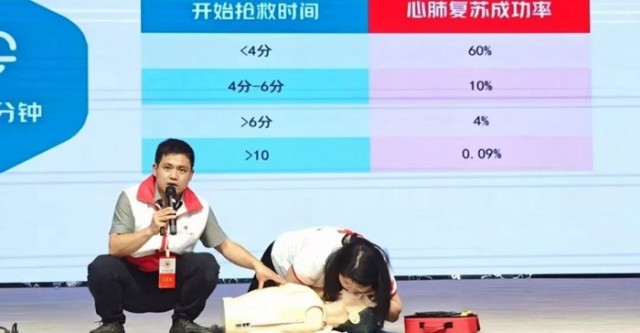 培训伊始,县红十字会讲师李文涛通过PPT展示和视频播放等形式向师生们讲解了心肺复苏的基本概念,强调了心肺复苏在抢救心脏骤停患者中的重要性:“心脏骤停后4分钟内是抢救的黄金时间,及时有效的CPR和AED使用能将生存率提高50%以上!”他用通俗易懂的语言,逐步分解了心肺复苏的操作流程和自动体外除颤仪(AED)的具体操作步骤。