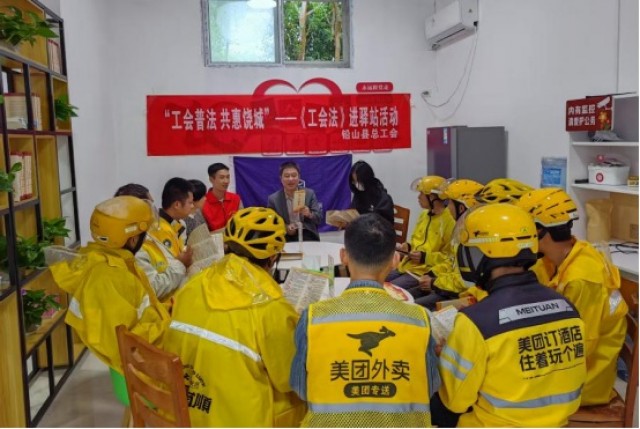 为加强对新就业形态劳动者的人文关怀和法治宣传教育,发挥新就业形态户外劳动者驿站服务效能,4月23日,铅山县总工会组织辖区外卖员和站点周边职工在九阳台工会驿站开展“工会普法共惠饶城”——《工会法》进驿站法律知识宣传活动。
