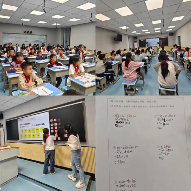 第二节示范课聚焦《简便运算的复习》,由逸夫小学郑佩佩老师呈现。郑老师以“变与不变”为主线,通过思维导图式板书构建运算定律知识网络,引导学生从“算式变形”中提炼本质规律。课堂创新设计“纠错诊所”“规律探秘”等环节,强化运算定律的迁移应用,助力学生形成结构化数学思维。