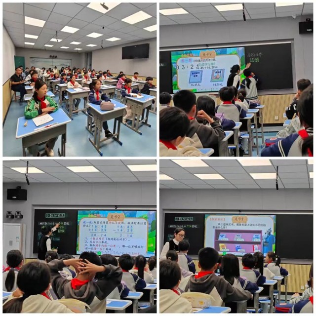 活动首节示范课由逸夫小学陈露老师执教《小数的加减法》。陈老师以“哪吒闯关”情境贯穿课堂,引导学生自主提问、合作探究,通过“摆一摆、说一说、算一算”等多元操作,呈现算法多样性,帮助学生厘清小数加减法“数位对齐”的核心算理。课堂注重学生思维可视化表达,有效突破了“小数点对齐”的教学难点,获得听课教师一致好评。