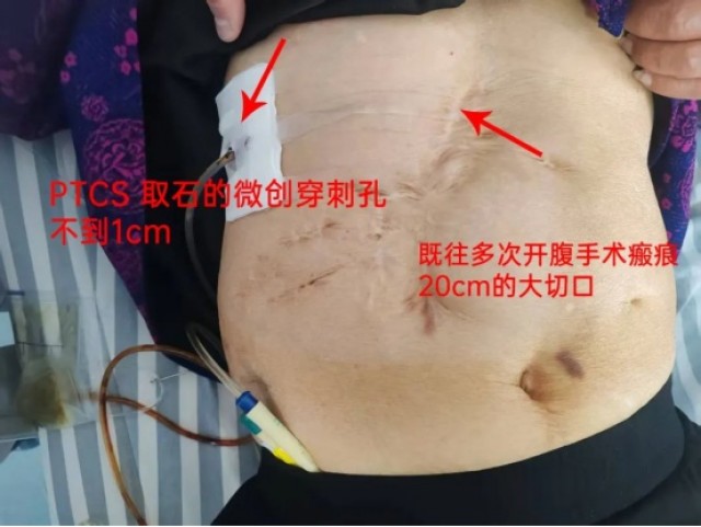 患者女性,78岁高龄,既往因“胆囊结石、肝内胆管结石”多次开腹手术,包括胆囊切除,其腹部手术长长的疤痕见证了患者多次开刀病史。近日,患者因上腹部胀痛不适、伴发热、恶心呕吐就诊于余干楚东医院肝胆外科。经过的详细检查与评估,确诊该患者肝内外胆管多发结石。面对患者复杂的病情,余干楚东医院肝胆外科团队联合广州医科大学附属第一医院朱教授进行多学科会诊,鉴于患者既往做过腹部手术,腹腔存在广泛粘连,不论是再次开刀或者腹腔镜手术都面临着脏器损伤的风险,为了更“微创”解决患者问题,决定施行经皮经肝胆道镜取石(PTCS)。