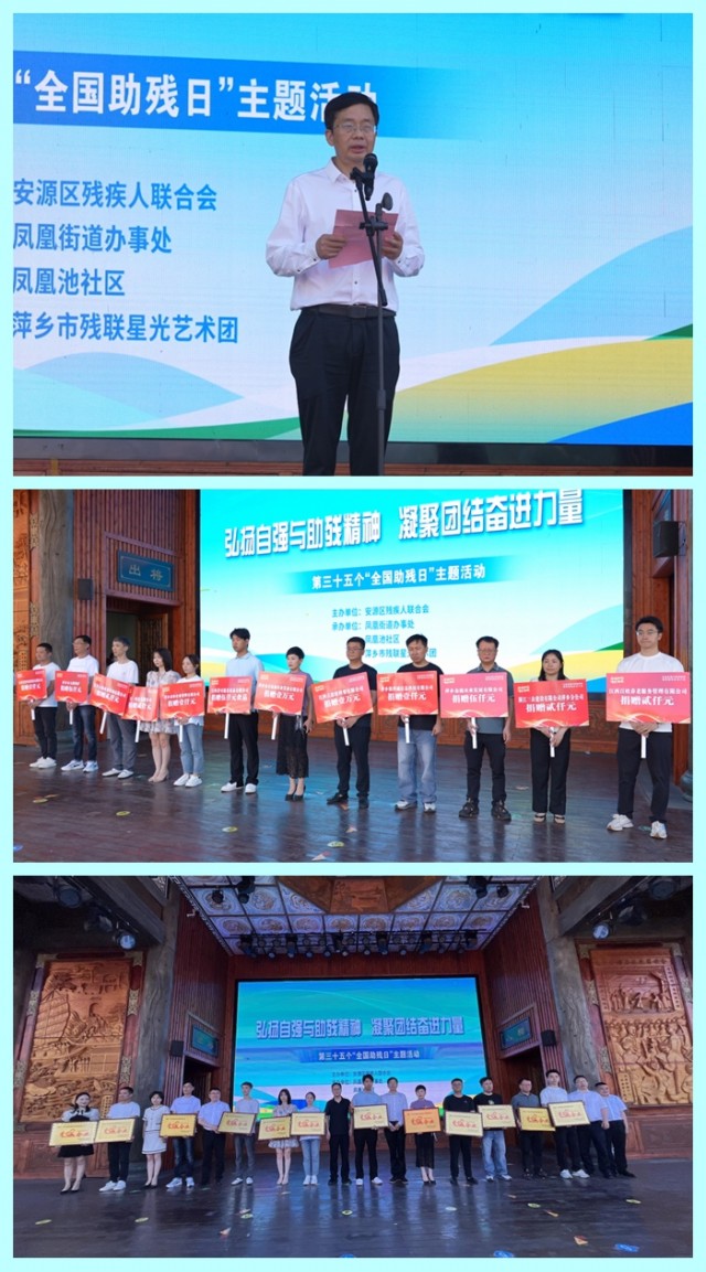 活动由安源区残疾人联合会主办,凤凰街道办事处、凤凰池社区、萍乡市残联星光艺术团承办,萍乡市残联党组书记郭建斌,党组成员、副理事长邓华,党组成员、挂职副理事长黄贵国,安源区区委副书记龚云华,副区长葛堃,安源区残联党组书记黄群,安源区残联理事长彭靓娜,区直机关相关领导、儿童康复机构负责人、爱心企业代表、残疾人代表以及市民群众代表相聚一堂,共同为残疾人群体送上关爱与帮扶。
