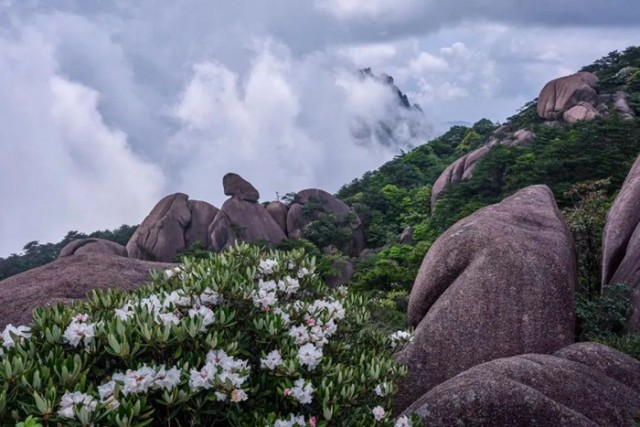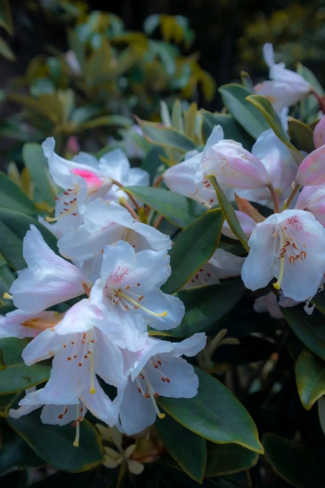 上饶灵山的猴头杜鹃的花朵硕大,5~9朵簇拥在一起,形成总状花序,它绝妙之处也在于其花色随光阴流转而变幻,初绽时如烈焰灼灼,红得炽烈,数日后渐染粉霞,似少女羞颊,继而沉淀为紫罗兰的深邃,最后归于素白,如雪覆枝头,一季花开,四色更迭,仿佛将四季的斑斓凝于一树。