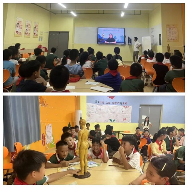 县中医院中医师通过幻灯片演示与模型教具,系统讲解足三里、合谷等常用穴位的定位及养生功效。结合《国礼故事》、《内景图》等视频,以故事化语言串联中医药发展脉络,生动展现现代中医振兴的文明长卷,激发孩子们对传统中医药文化的兴趣。