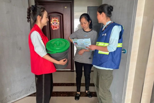 与此同时,工作人员与志愿者开启“敲门行动”,带着宣传手册和二分类垃圾桶逐户走访。每敲开一户家门,他们便发放手册、讲解分类标准,为未领桶的住户送上二分类垃圾桶,并现场演示使用方法:“剩饭剩菜放绿桶,纸巾塑料袋放黑桶,这样分拣更清晰。”他们用耐心和细致,确保每一户居民“分得明白、投得准确”。