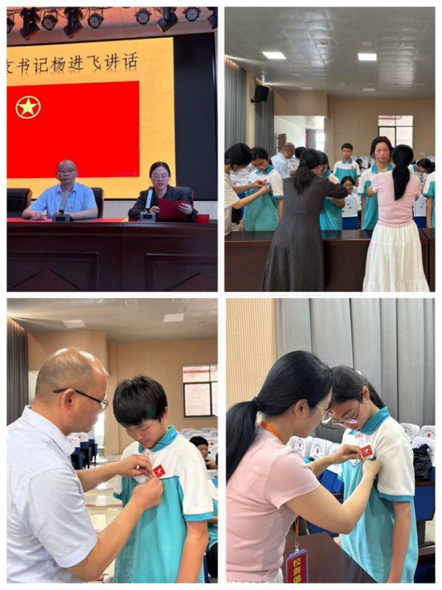 之后,学校党支部书记饶江成、副书记曾燕、团支部书记杨进飞老师和党员教师杨俊慧老师为新团员颁发、佩戴团徽。当闪耀的团徽佩戴在新团员们胸前,他们眼中满是自豪与责任。