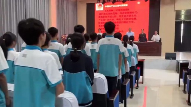 随后,校党支部副书记曾燕老师宣读了关于批准李语晗等22名同学加入中国共产主义青年团的决定。紧接着,团支部书记杨进飞老师为新团员们讲解了团徽的意义。中国共产主义青年团团徽由团旗、齿轮、麦穗、初升的太阳及其光芒,以及写有“中国共青团”五字的绶带组成,象征着共青团在党的思想光辉照耀下,团结各族青年,朝着党所指引的方向奋勇前进。