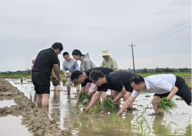 稍后,党员们迫不及待纷纷撸起袖子、挽起裤脚,踏入水田开展插秧实践。尽管泥浆裹腿,但大家干劲十足。党员里少数插秧行家里手穿梭在田间,手把手指导,及时纠正插秧角度、深度等问题。党员们左手托秧苗,右手分苗、插秧,整齐的秧苗在水田里铺展,构成一幅生机勃勃的农耕画卷。
