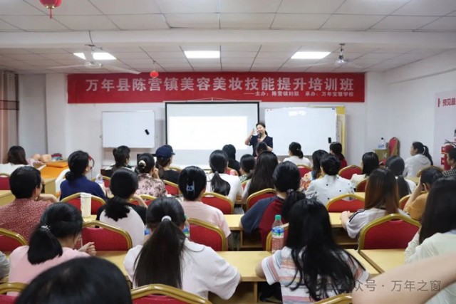 化妆分为底妆、眼妆、唇妆三个步骤,我给大家现场示范一下,不懂的可以问我,首先我们先进行底妆护理……”近日,由万年县陈营镇妇联举办的美容美妆技能提升培训班在万年宝慧学校举行,专业老师正在为60余名妇女培训美容美发美甲相关知识。