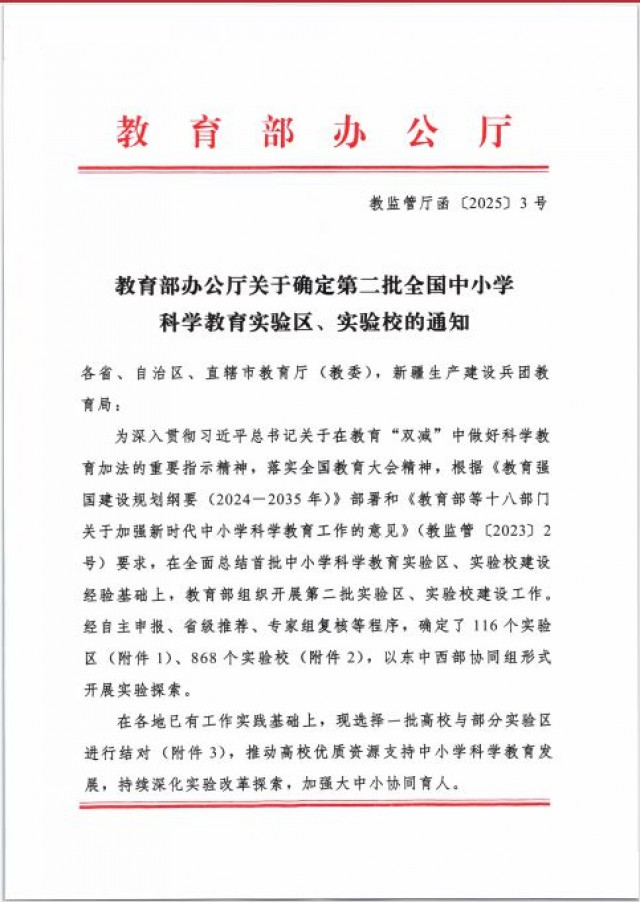 近日,从教育部办公厅印发《关于确定第二批全国中小学科学教育实验区、实验校的通知》(教监管厅函〔2025〕3号)获悉,婺源县紫阳第六小学成功入选第二批全国中小学科学教育实验校。