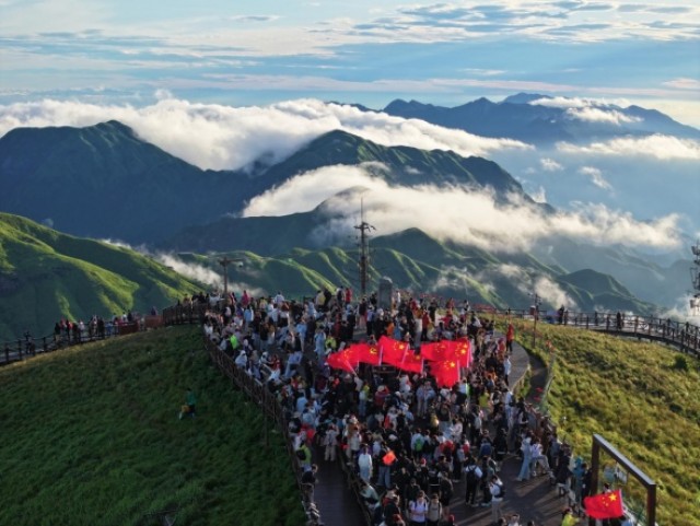为激发游客爱国、爱党热情,萍乡武功山景区精心策划红旗漫卷青山初心照耀云端爱国主义主题系列活动,其中金顶护旗仪式成为核心亮点。清晨日出时分,由景区党员志愿者和游客共同组成的护旗方阵,沿千米高山游步道庄严护送国旗至金顶观景台,通过庄严仪式让游客深刻体悟国旗的重量就是信仰的重量。来自南昌的大学生游客李麒激动地说:当亲手触摸到被山风鼓动的国旗时,突然明白了什么是‘把信仰举过头顶’,今天真切的让我们感受到血脉里的红色基因。