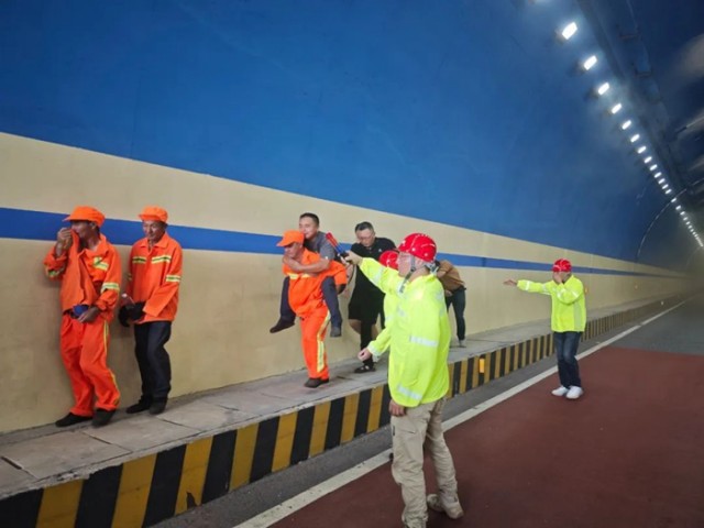 在G353时光隧道现场,随着该中心应急救援演练总指挥一声令下,演练正式开始。此次演练模拟场景为时光隧道左洞内,一辆小车突发自燃事故。接到险情报告后,该中心立即启动应急预案。警戒组迅速按照指令在隧道相关区域设置警示标志和路障,对周边道路进行交通管制,阻止无关车辆和人员进入危险区域。义务消防队第一时间赶赴现场,组织人员疏散并利用隧道内消防设施进行初期火灾扑救;同时设置隔离区域,引导车辆人员安全撤离,整个演练过程紧张有序,各环节衔接紧密。