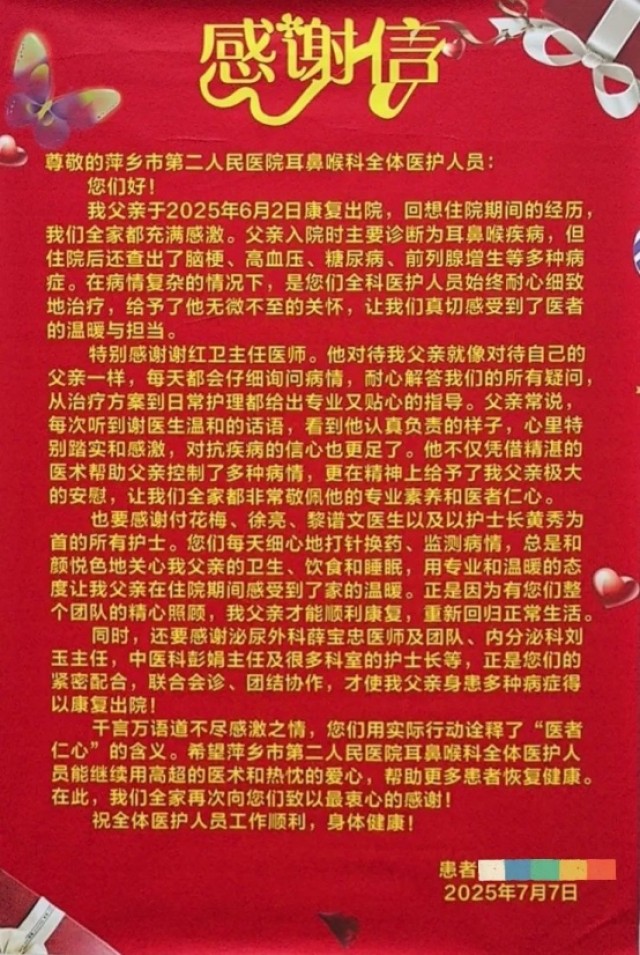 七月的一天,萍乡市第二人民医院耳鼻喉科收到一封特殊来信。字里行间是患者李爷爷(化名)的家属对生命守护者的深深情意。这封感谢信,是谢意的表达,更是医患情深的动人赞歌。