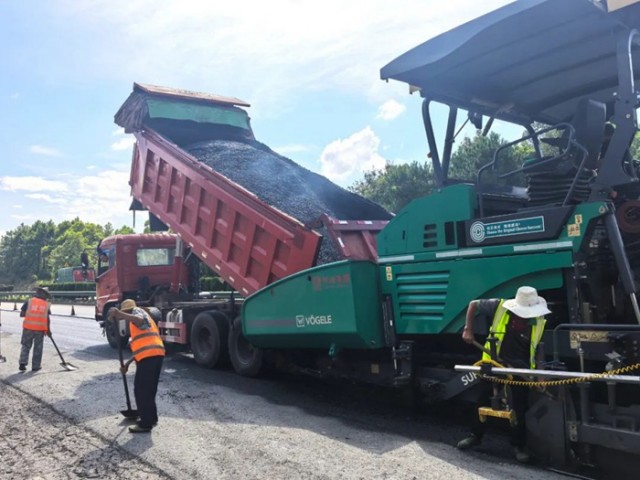 为抢抓晴好天气,连日来,在G320国道沪瑞线上饶市信州区段修复养护工程现场,一辆辆运输车辆往来穿梭,摊铺车、压路机等机械轮番上场,施工人员各司其职、有序作业,路面摊铺作业如火如荼进行,力争8月底前完工通车。