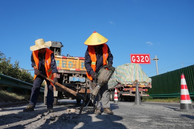 8月13日,在横峰县和广信去交界G320国道上,装载机将翻滚着气泡的黑色骨料卸到作业区时,腾起的热浪几乎要灼伤人的睫毛。养护工们严格遵循“圆洞方补、斜洞正补”的技术规范,用铁镐凿除破损路面,便携式吹风机吹扫碎屑,再用长柄毛刷均匀涂刷乳化沥青底油,他们豆大的汗珠刚滚落额头便被蒸干,橘色工装湿了又干,胸前背后结出盐霜的地图。