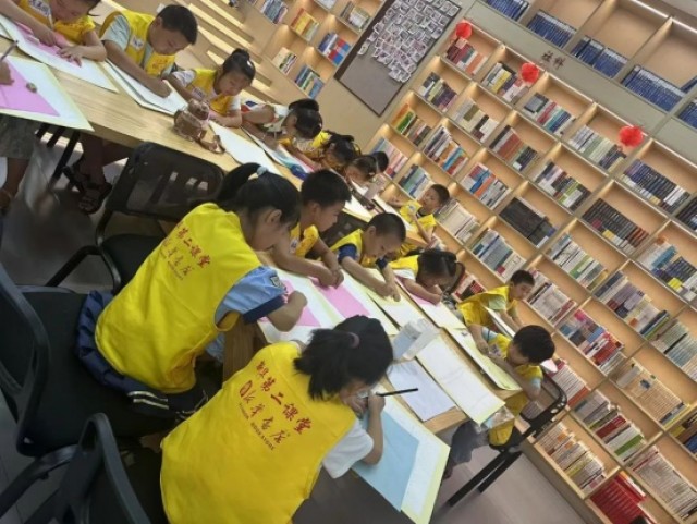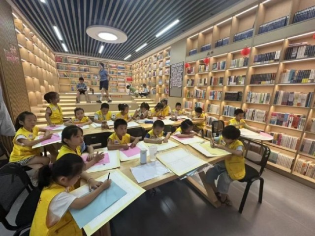 作品完成后,小朋友们轮流举起画纸,骄傲地介绍自己的创意。“这是我的‘魔法森林’,小兔子踩着云朵,蘑菇会发光!”“我画的小熊在看书,就像我们在书房里一样~”。没有“标准答案”,没有“必须这样画”的约束,只有天马行空的想象和不加修饰的童真。当所有画作在书架旁一字排开,仿佛一片小小的童话天地,连路过的读者都忍不住驻足点赞:“孩子们的想象力太厉害啦!”