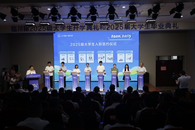 活动现场还观看了临川区情宣传片,2025届高校毕业生、2025级大学新生、“才子归巢”暑期社会实践学生、在临创新创业的优秀大学生代表分别发言,举行了2025届大学生入职签约、2025级大学生助学金发放、临川区首批大学生实习实践基地授牌、临川区“校园引才大使”聘书颁发仪式,临川籍2025届新生代表、毕业生代表以及“才子归巢”学子代表齐诵“学成归来报效家乡”大学生宣言。