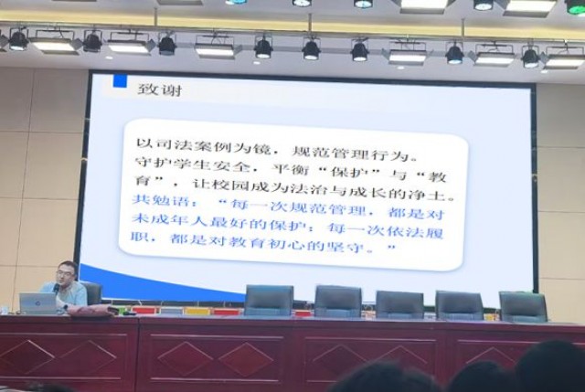 杨律师以《涉校民事纠纷典型案例解析》为主题,结合《民法典》相关条款,系统阐释了校园伤害责任认定原则、风险防控建议及家校协同管理要点。通过真实案例剖析,帮助教职工厘清法律权责边界,强化依法履职意识和风险防范能力。