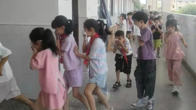 演练前,学校制定详细方案,明确疏散路线、人员分工及注意事项。随着警报声响起,各班学生在教师引导下,迅速用衣物捂住口鼻、弯腰低姿,沿安全通道有序撤离至指定区域,并完成人数清点,整个过程紧凑有序,未出现慌乱情况。