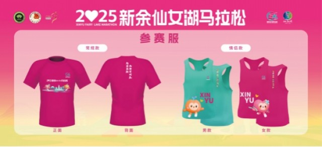 常规款参赛服在设计上以象征爱情的粉红色为底色,巧思融合新余特色建筑与景致,搭配“仙女湖”书法字体,借由丰富明快的色彩组合,营造出赛事欢乐、年轻且充满地域特色的氛围。