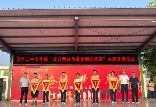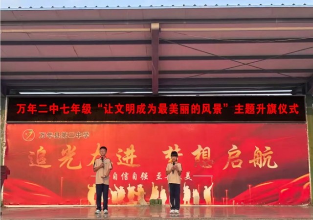 晨光熹微,秋风送爽,10月13日清晨,万年县第二中学七年级全体师生齐聚操场,举行“让文明成为校园最美丽的风景”主题升旗仪式。升旗仪式由七(1)班夏李艺、周景一同学主持,他们声音清亮,仪态大方,如林间清泉,流淌出青春的朝气与庄重。