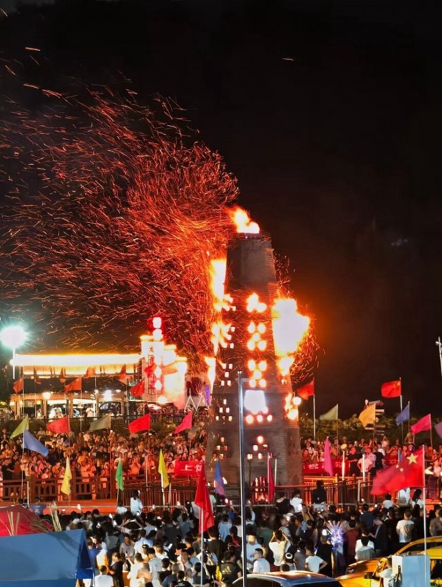 当晚的主角——六角七层红砖塔,以“9.9米”的高度寓意“长长久久、步步高升”。塔内填充的稻草、柴火与盐粒在烈焰中迸发蓝紫色光芒,盐粒爆裂如星雨纷落,形成“火树银花不夜天”的奇景。而点火仪式的创新设计更成为全场焦点:来自沽溪村的北大学子手持火把,在孩童与村民的注视下点燃塔顶,完成一场跨越时空的“状元接力”。