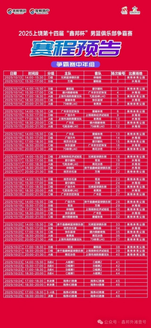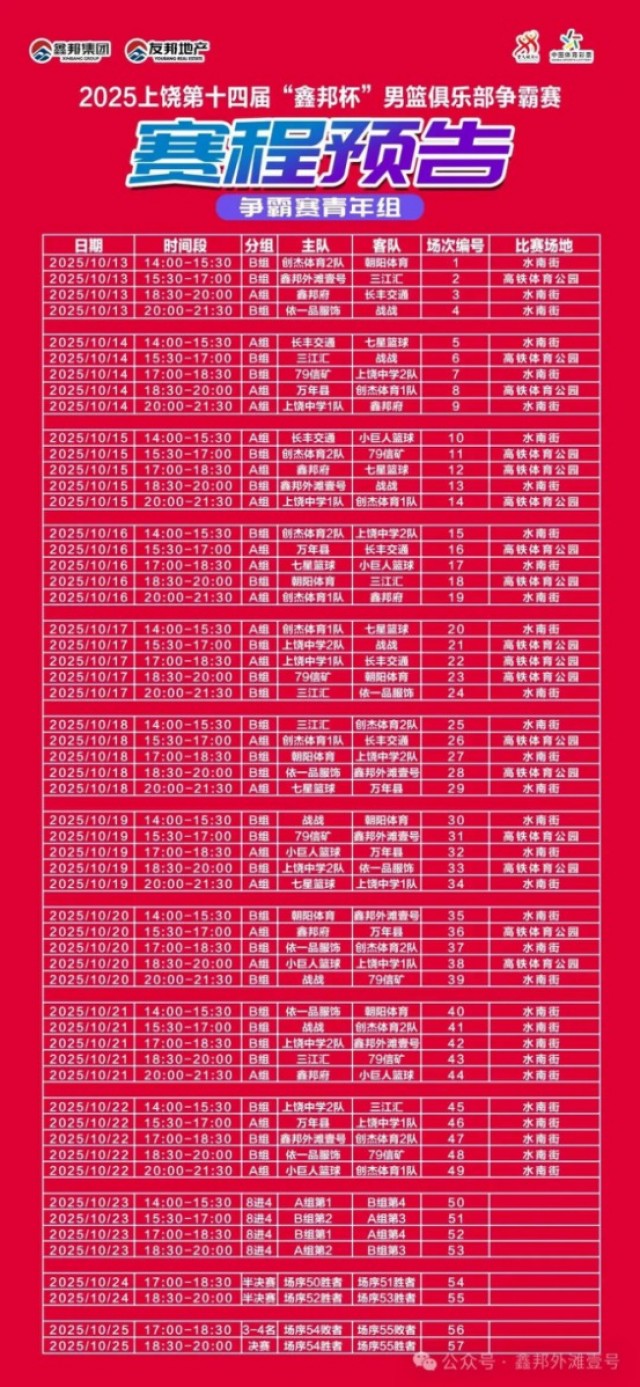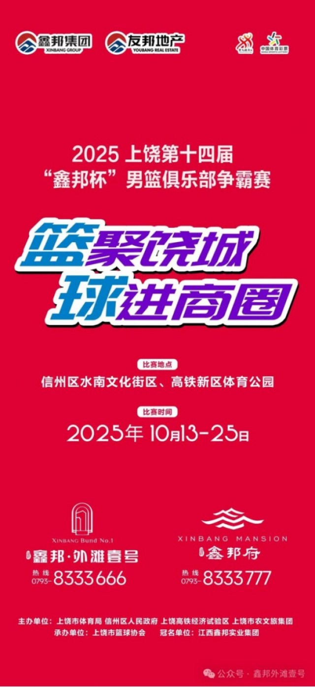 由上饶市体育局、信州区人民政府、上饶高铁经济试验区管委会、上饶市农文旅集团联合主办,鑫邦集团独家冠名的2025年上饶第十四届“鑫邦杯”男篮俱乐部争霸赛将于10月13日至25日在水南街文化街区及高铁新区体育公园举行。赛事将组织35支俱乐部、500余名运动员参赛。