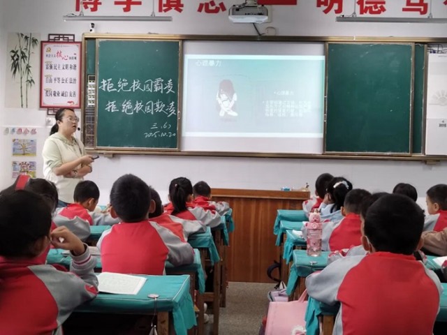 班会课上,班主任运用案例分析向队员们展示了校园欺凌给受害者带来的伤害及严重后果,教会孩子们应该如何应对校园欺凌,并通过正常程序和法律途径来维护自身的权利,做遵纪守法的好学生。