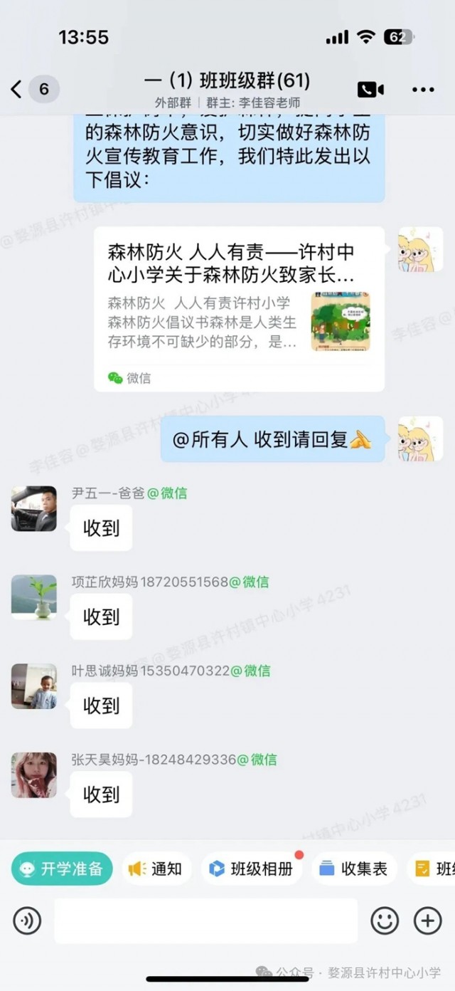 学校通过校园公众号、班级微信群等渠道向全体学生家长发送《森林防火致家长的一封信》,信中详细列举了森林火灾的法律法规、典型案例及防火倡议,如“不在林区烧荒、不携带火种入山、文明祭祀”等,并附有防火知识问答和紧急联络方式。通过“小手拉大手”模式,要求学生与家长共同学习,确保防火教育覆盖家庭。