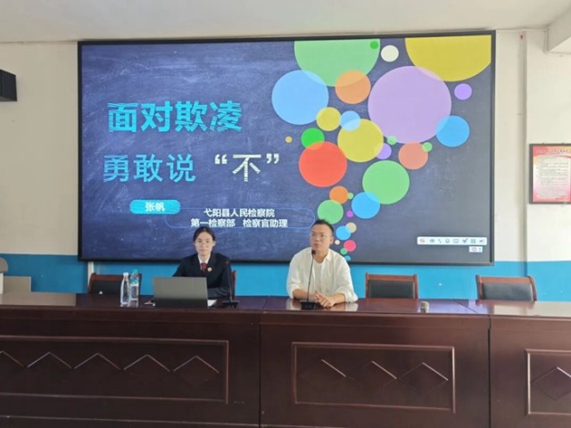 为增强学生的法治意识,提高自我防范意识,预防校园欺凌,建设平安和谐校园,2025年10月28日,弋阳县漆工中学邀请县人民检察院第一检察部检察官助理张帆到校开展以“面对欺凌,勇敢说不”为主题的法治宣讲活动。活动由校党支部书记、校长饶昌主持。