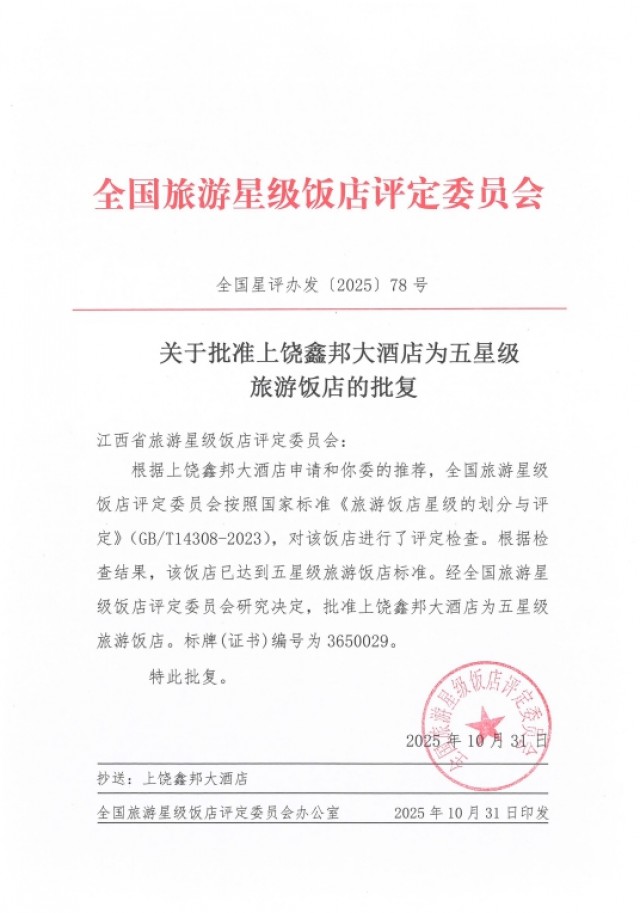 2025年10月31日,经全国旅游星级饭店评定委员会综合评定上饶鑫邦大酒店,正式获评五星级旅游饭店。此次评定为上饶高端酒店项目树立了新的标杆,更是为本地旅游业发展注入强劲动力。