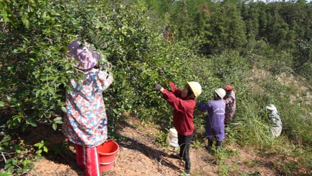 戴坊镇油茶种植户李金龙:“现在正值油茶采摘时节,我家里种了300多亩油茶,今天雇了28个人采摘,预计今年亩产量在700斤左右。”