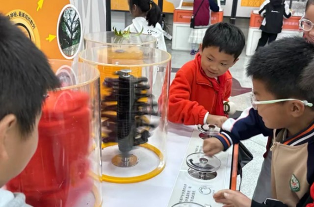 参观当日,尽管天气微凉湿润,但孩子们探索热情高涨,他们轻快地走进位于陶博馆一楼大厅的流动科技馆。馆内近40件互动展品,为孩子们开启了一场“看、摸、玩、想”的科学盛宴。