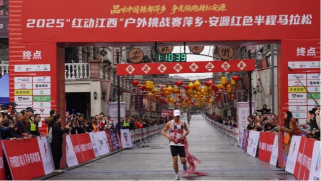 最令人热血沸腾的当属安源广场前的终点角逐。来自南昌大学的大四学生段良玉在最后200米突然加速,雨水顺着他的鬓角滴落,浸湿的运动服紧紧贴在身上,目光却紧盯着终点门前迎风招展的横幅。当他冲过终点线、撞向横幅的瞬间,计时器定格在1小时10分39秒,现场欢呼声瞬间爆发,段良玉成功摘得男子组桂冠。“从秋收起义广场起跑时,看着纪念碑就特别振奋,沿途的红色标语一直推着我往前冲!”赛后,段良玉抹了把脸上的汗水,语气难掩兴奋,“跑到安源纪念馆的那一刻,感觉像是完成了一场与历史的对话,这种体验一辈子都忘不了!”据悉,尽管连续一周辗转各地参赛,这位青年小将仍凭借顽强毅力保持最佳状态,展现出新时代青年的拼搏风采。