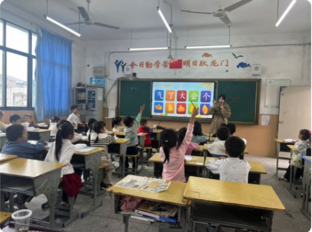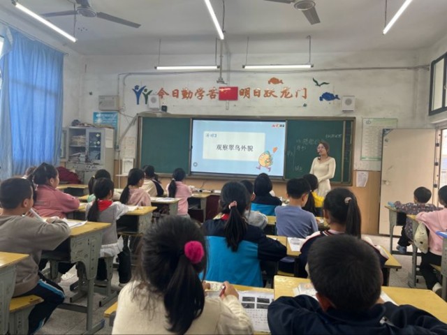 王菲老师在三(3)班讲授《搭船的鸟》,以亲切教态引导学生观察翠鸟外形与动作,通过情境模拟、画图分享等形式,让学生在互动中提升观察与写作能力。钟羽钦老师在三(1)班执教《金色的草地》,以生动演示和巧妙提问调动学生参与热情,让学生细致观察草地颜色变化奥秘,课堂氛围轻松且富有童趣。叶翠翠老师在五(3)班带来《鸟的天堂》,用优美语言描绘场景,借助AI导游发朋友圈的线索,引导学生感受“鸟的天堂”的壮观,提升了学生的语文审美与表达能力。