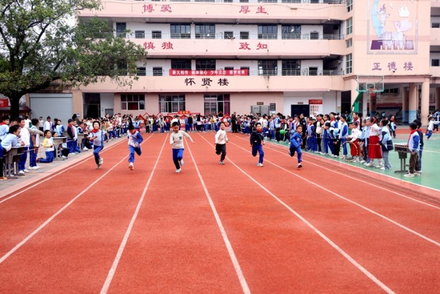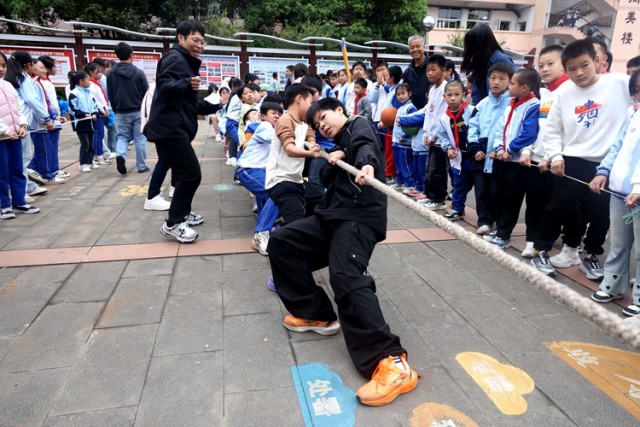 团体项目更是高潮迭起。40米迎面接力赛中,队员们默契配合、快速交接,用速度与协作书写着班级 的荣耀;一、二年级的夹垫跳比赛,同学们用双腿夹着垫子奋力跳跃,即使垫子掉落也不气馁,重新捡 起继续前进;三、四年级的蜗牛赛跑,队员们双脚站在呼啦圈里小碎步前进,小心翼翼却又充满力量;五、六年级的拔河比赛,双方队员紧握绳子、齐心协力,现场的欢呼声、呐喊声此起彼伏,气氛紧张而热烈。
