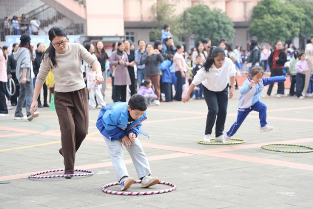 亲子团体赛同样温馨而精彩。1-4年级的亲子跳圈、抬球向前冲、一圈到底、猩猩搬球等项目,家长与孩子默契配合、携手闯关。在这个过程中,他们不仅收获了快乐,更增进了亲子感情。每一个温馨的瞬间、每一次默契的配合,都成为了赛场上最动人的风景。